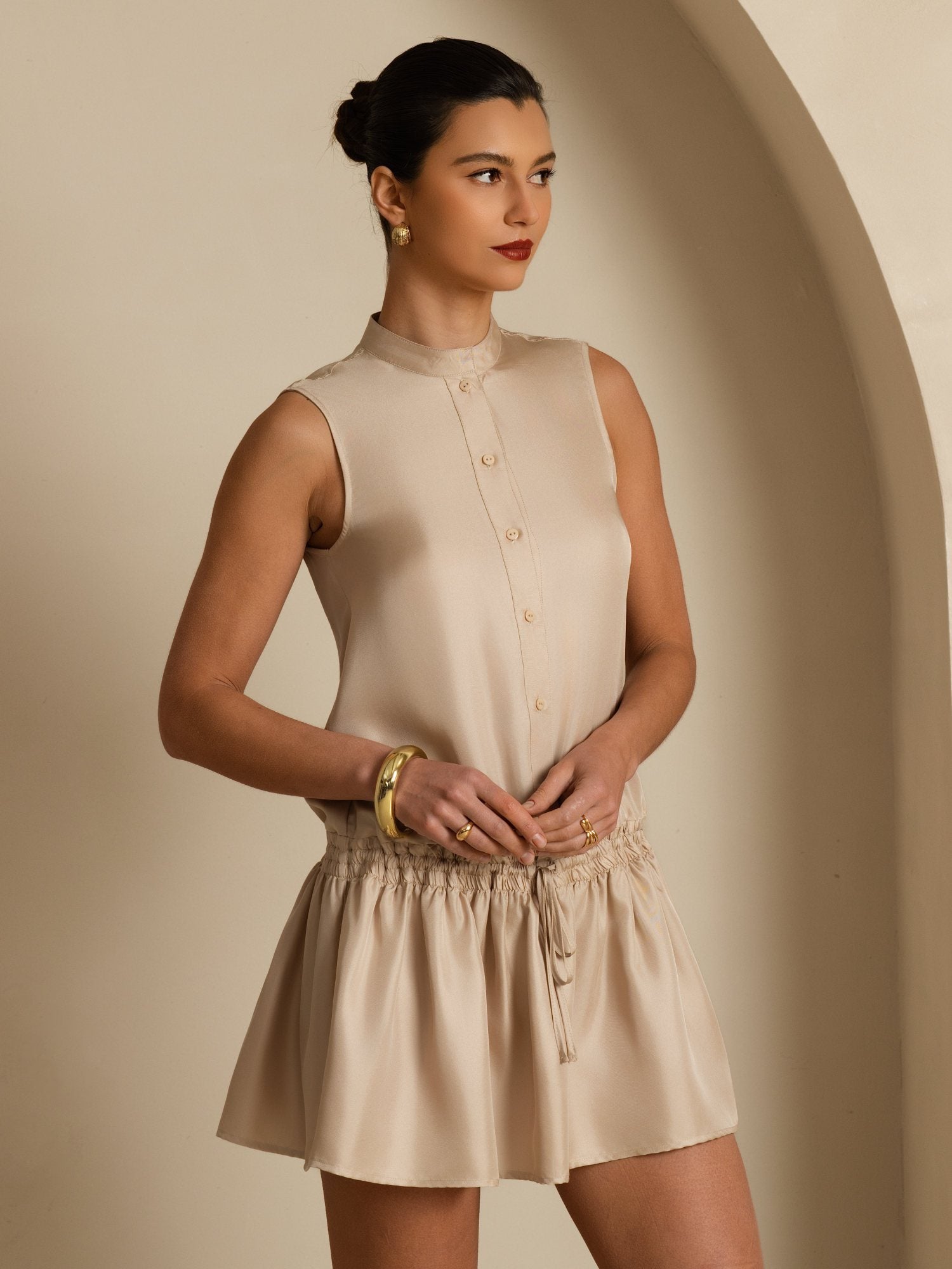 Made from 100% mulberry pure silk, this dress blends softness with subtle structure. The adjustable drawstring waist allows for adjustable shaping, while the clean solid color design emphasizes understated elegance. Lightweight and breathable, it transitions seamlessly from casual daytime wear to chic going-out occasions.A refined essential that balances comfort, femininity, and modern simplicity.