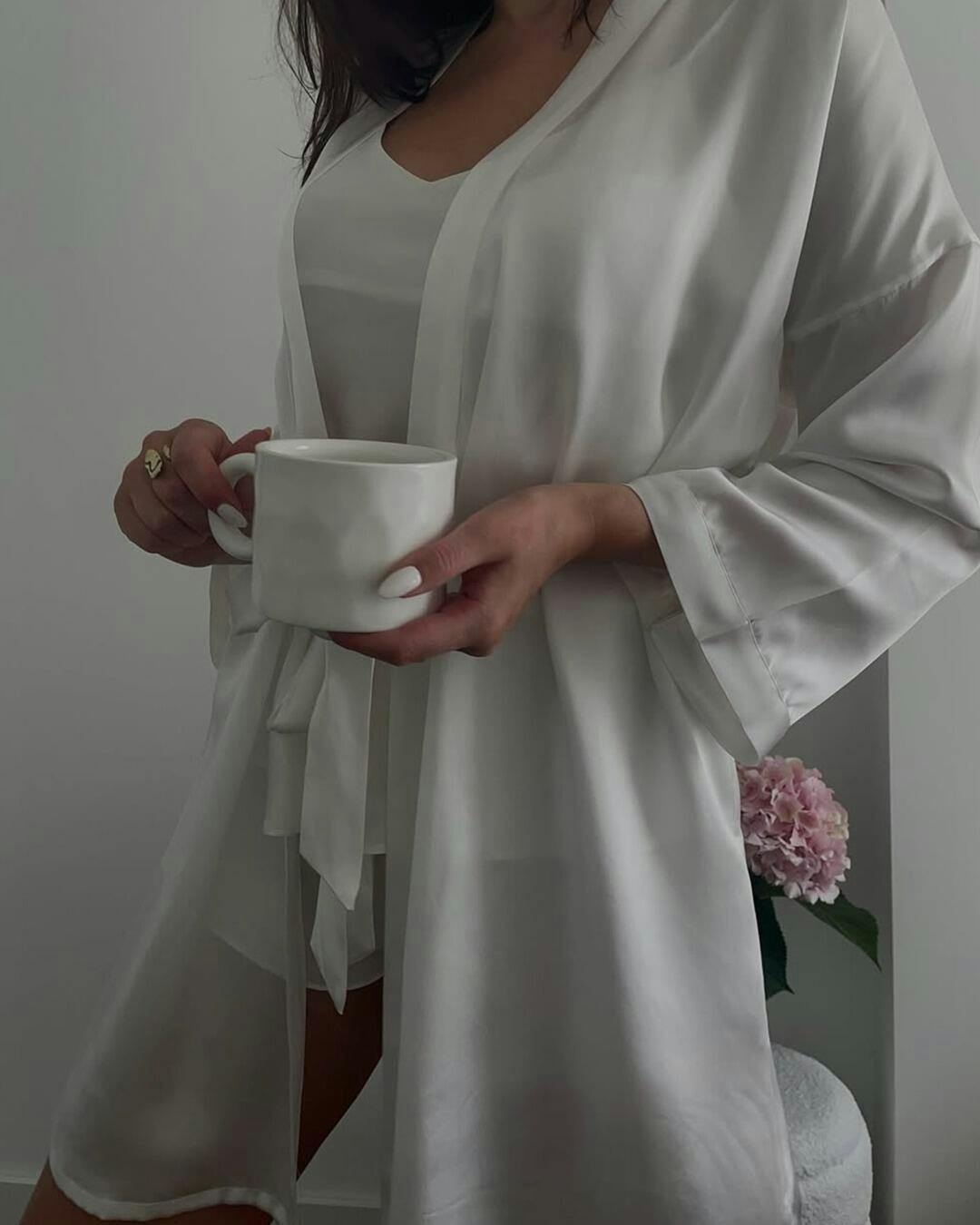 Proprio il tipo di pigiama che volevo: comodo ma comunque elegante. La seta bianca ha un bagliore delicato e si sente molto morbida sulla pelle.