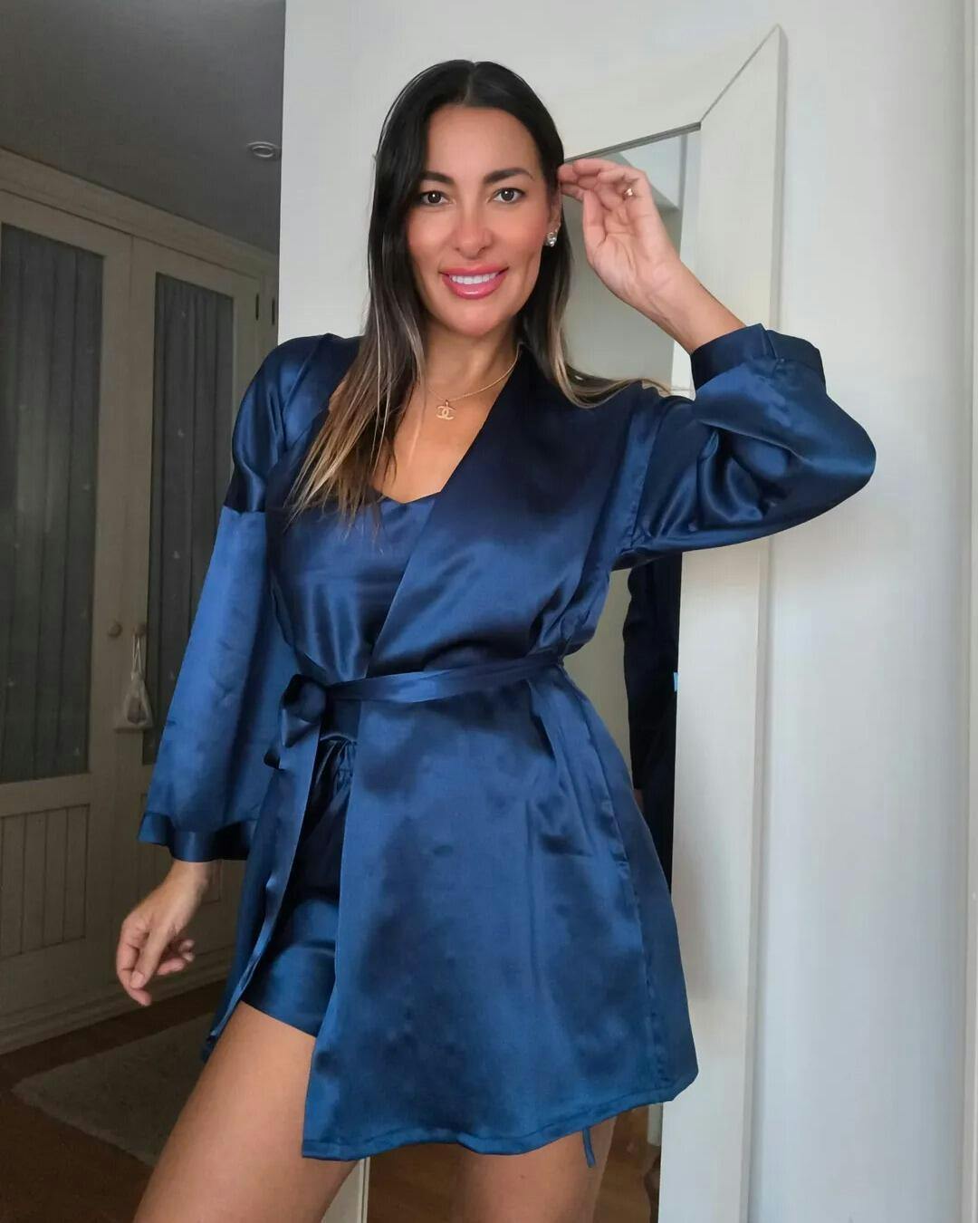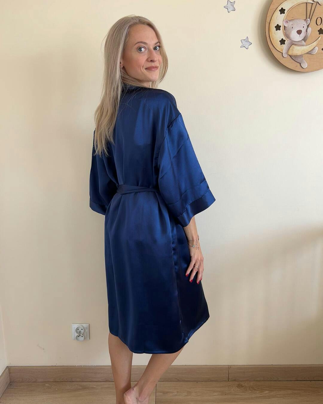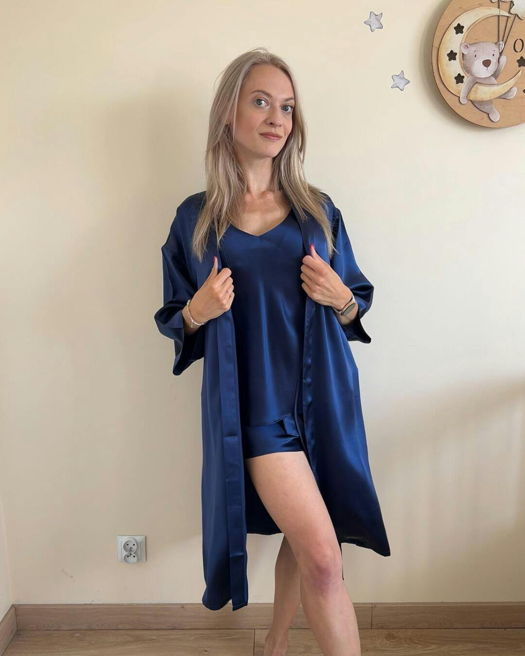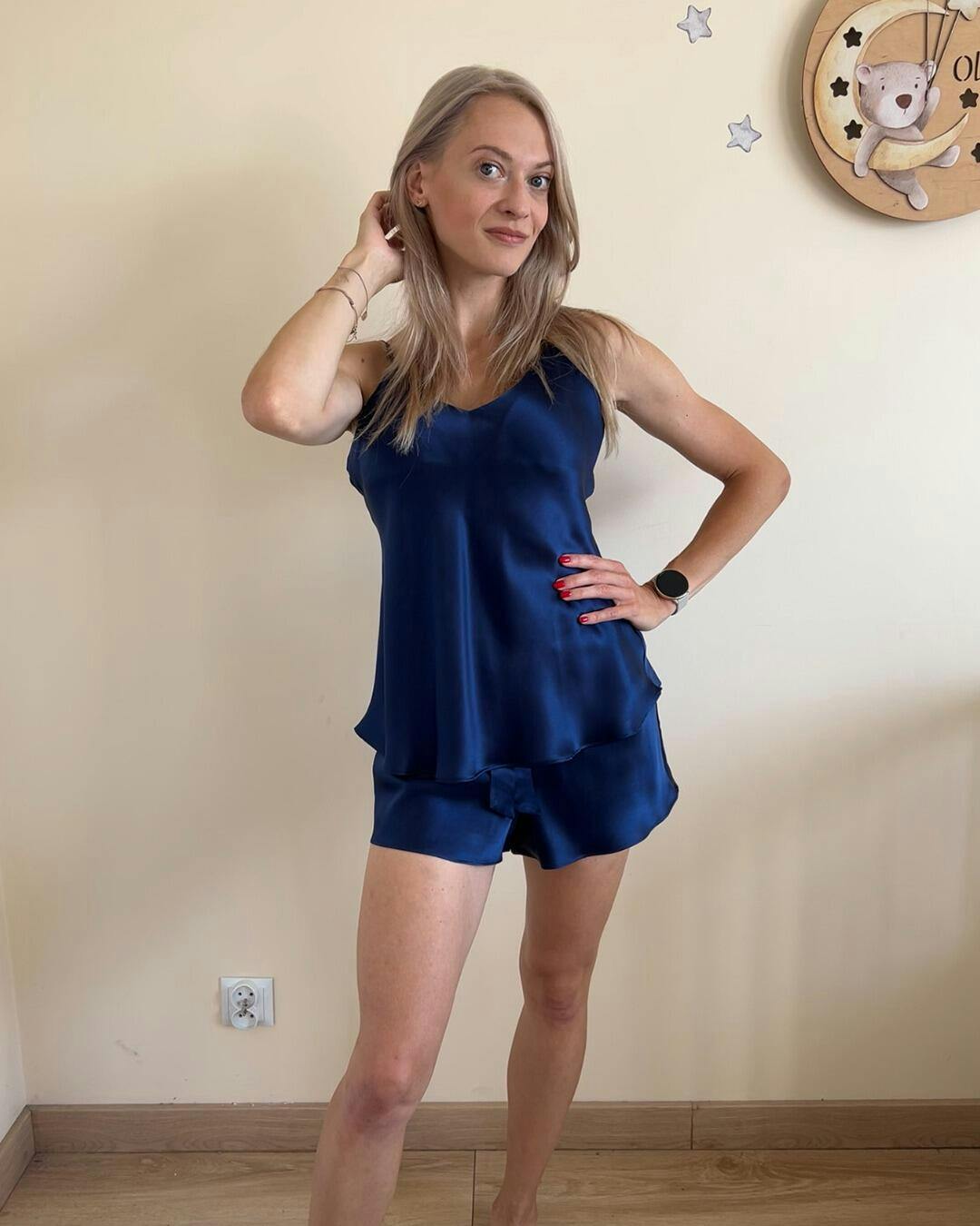 Vestibilità perfetta! La seta blu scuro è leggera e liscia, e il design è semplice ma valorizzante.
