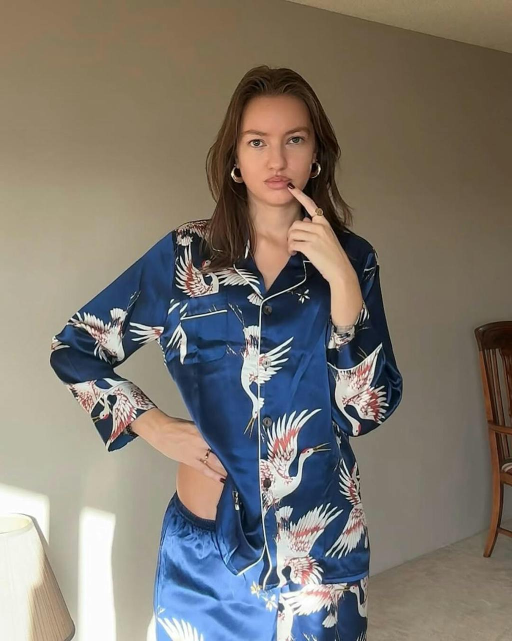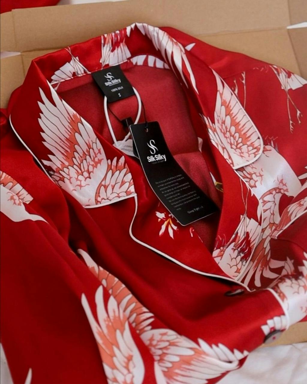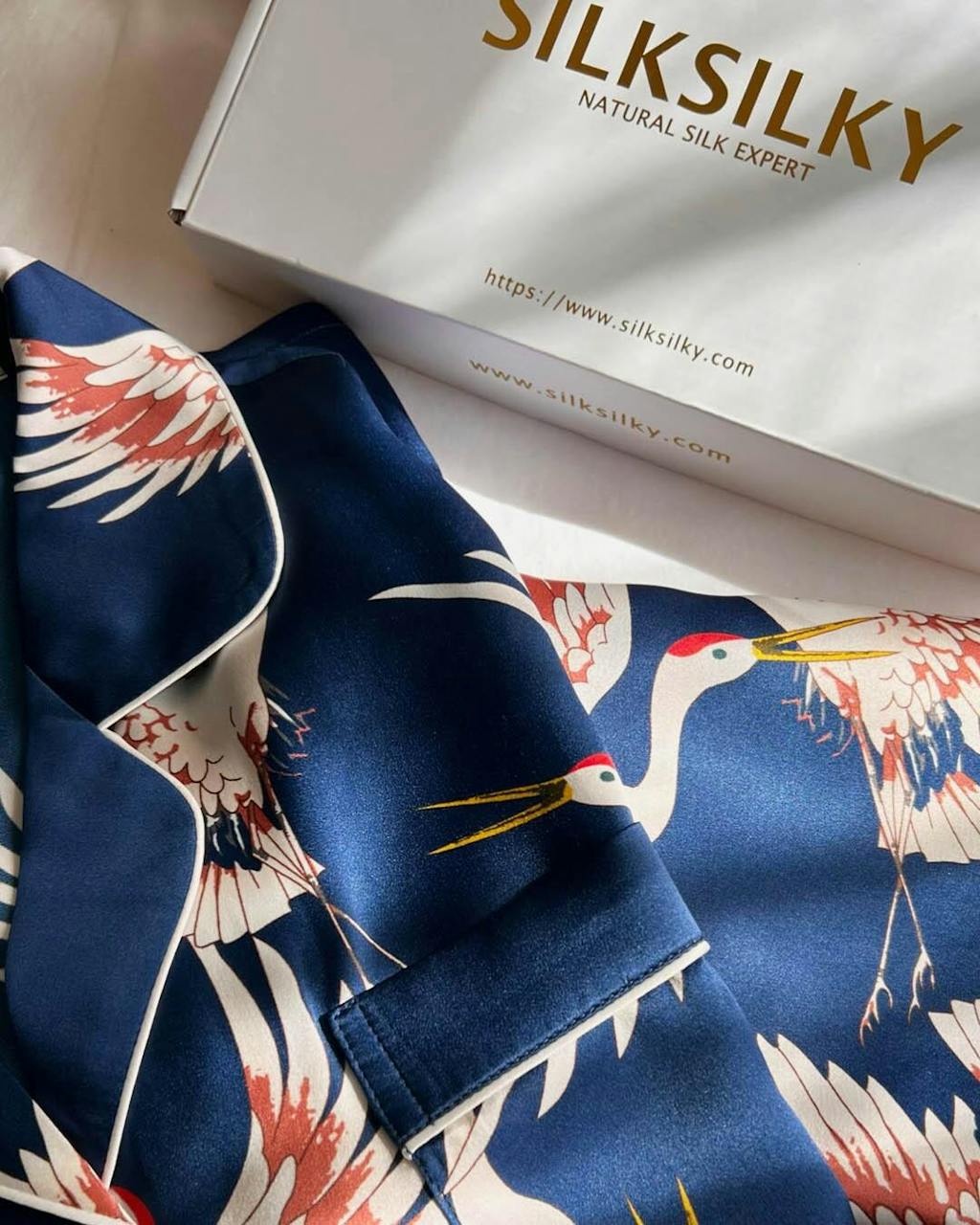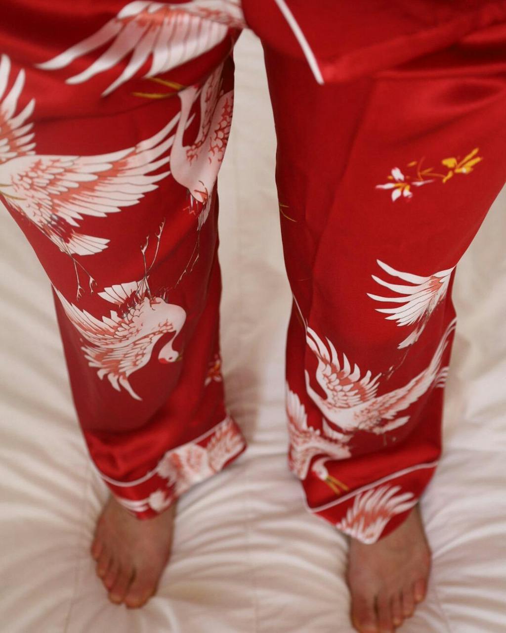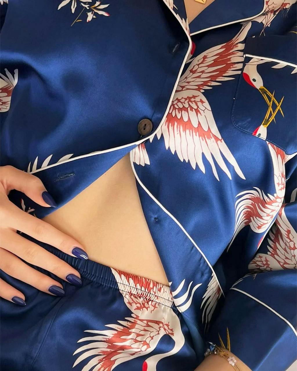 I can’t get over how unique and beautiful this pajama set looks! The crane print adds such a graceful touch, and the silk has this soft, fluid drape that moves so nicely. I wore it on a boat trip and got more compliments than I expected—it’s bold, elegant, and definitely a standout.