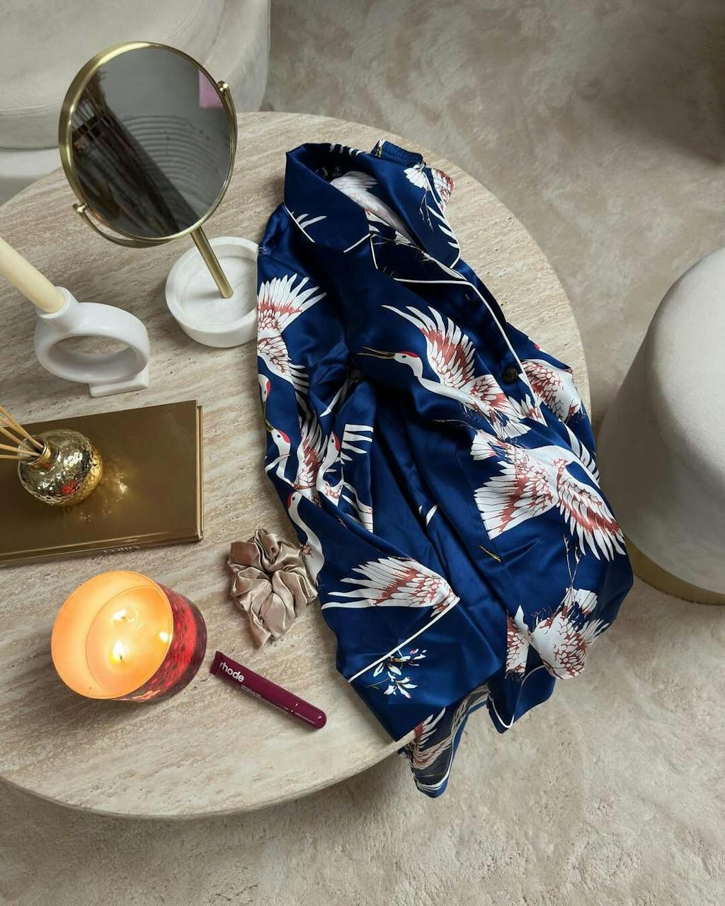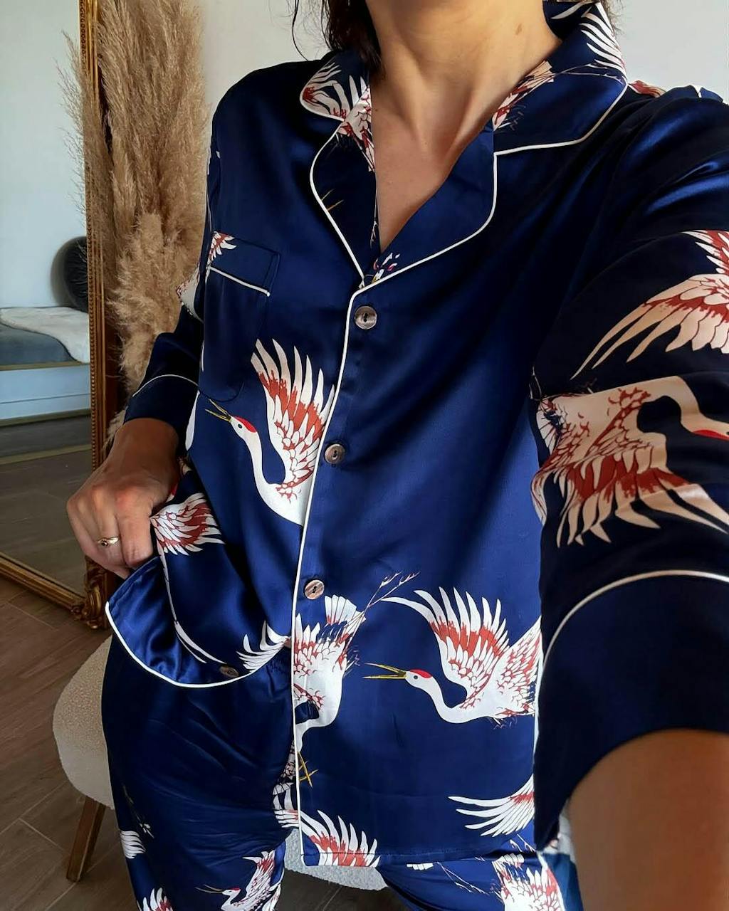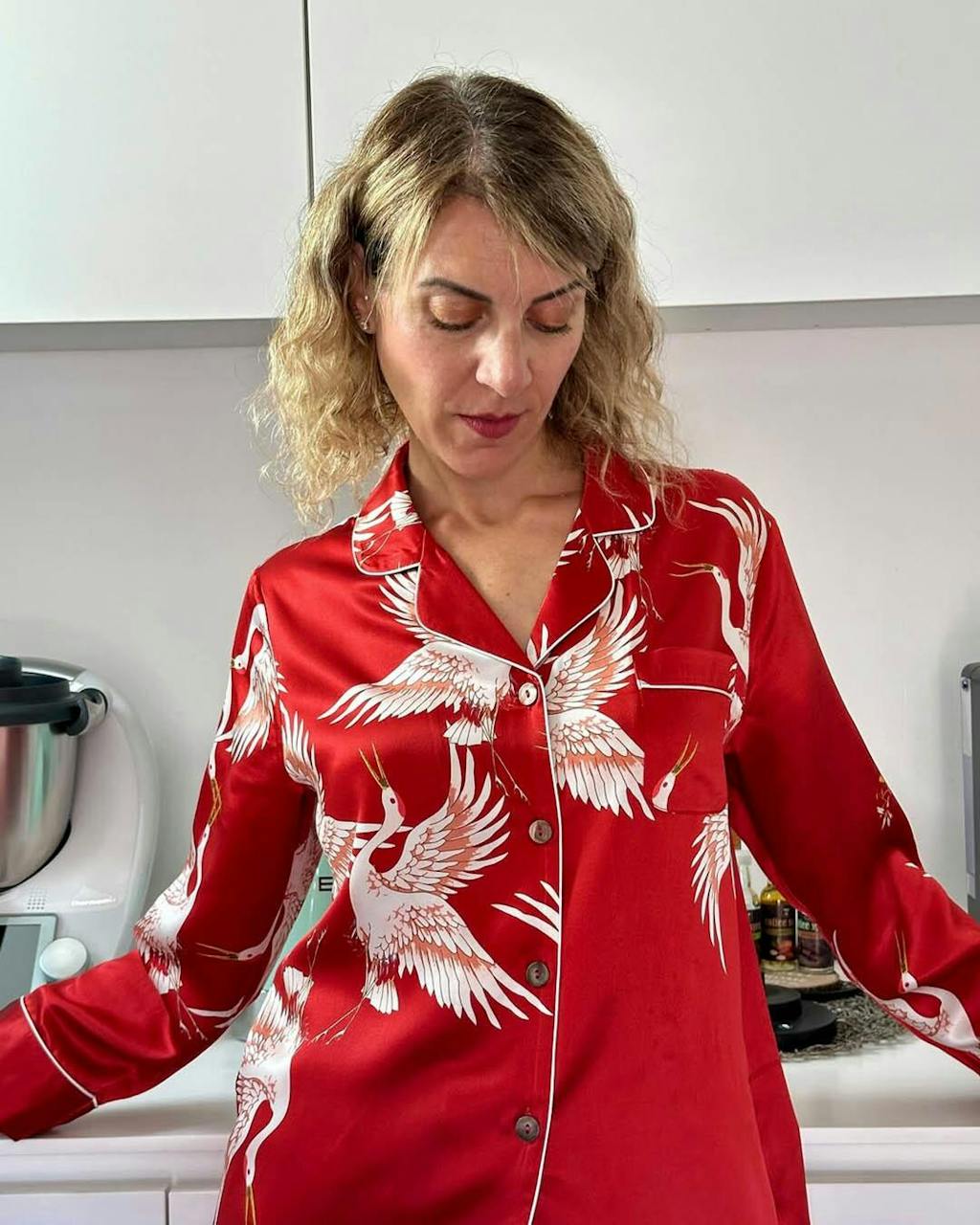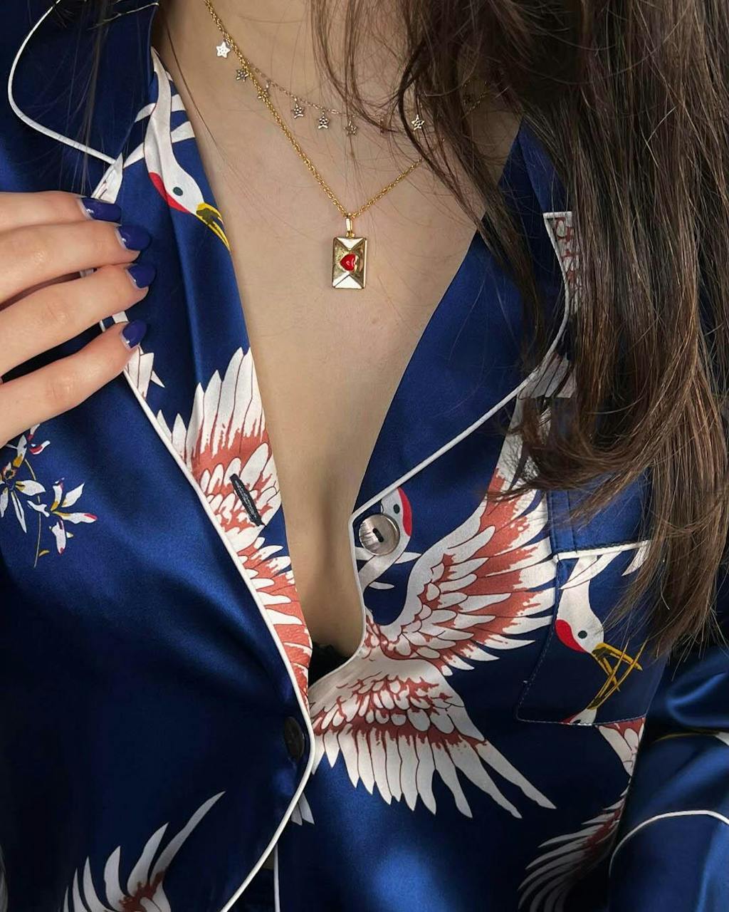 I can’t get over how unique and beautiful this pajama set looks! The crane print adds such a graceful touch, and the silk has this soft, fluid drape that moves so nicely. I wore it on a boat trip and got more compliments than I expected—it’s bold, elegant, and definitely a standout.