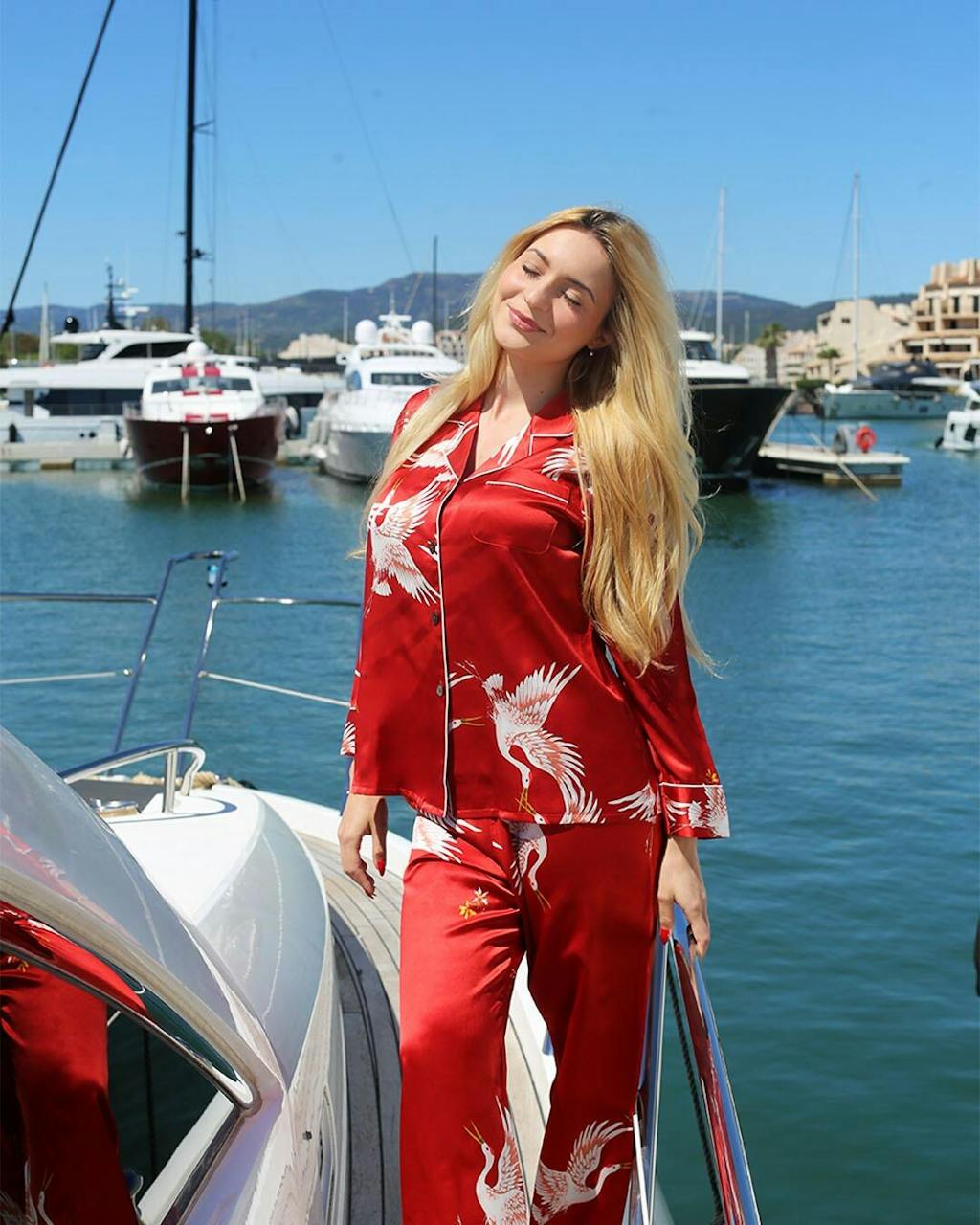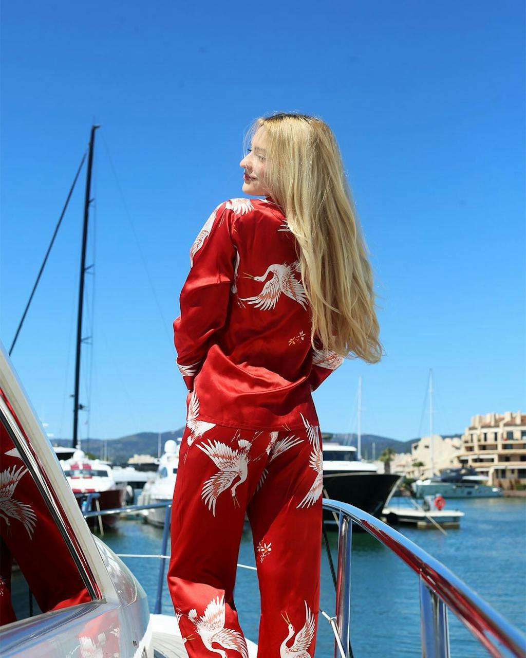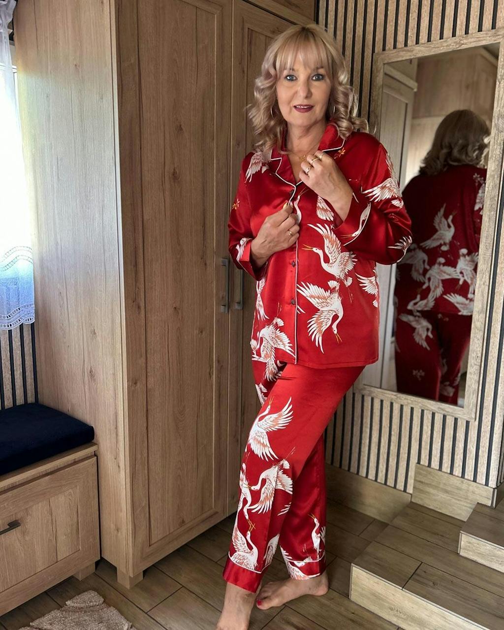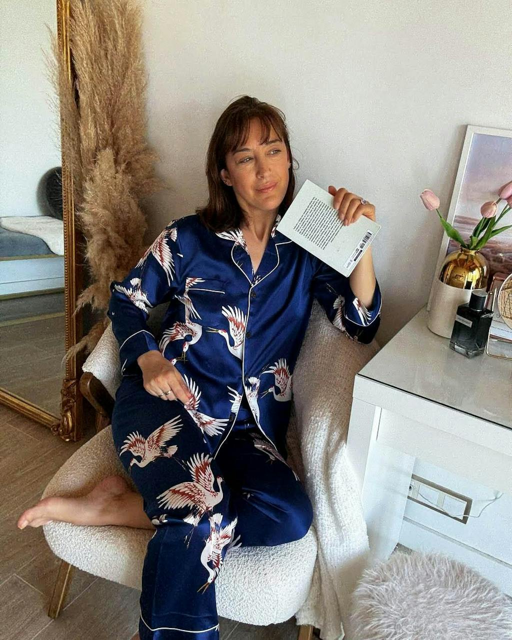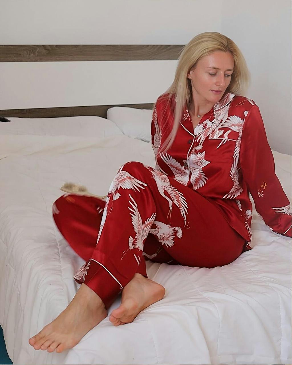 I can’t get over how unique and beautiful this pajama set looks! The crane print adds such a graceful touch, and the silk has this soft, fluid drape that moves so nicely. I wore it on a boat trip and got more compliments than I expected—it’s bold, elegant, and definitely a standout.